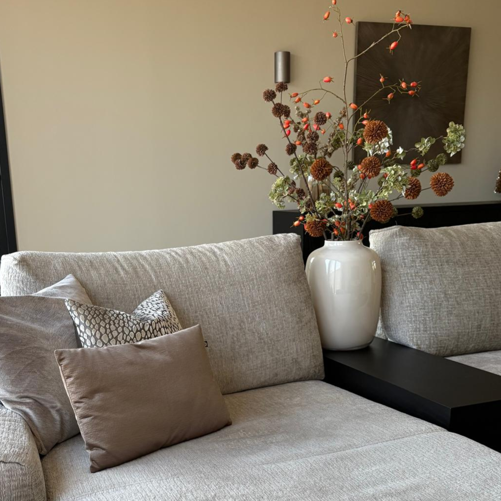 Durf juist te combineren. Op een beige bank werken kussens in donkerbruin, taupe of warme chocolade-tinten fantastisch. Ze creëren contrast, versterken de luxe uitstraling en laten de stof écht tot zijn recht komen.